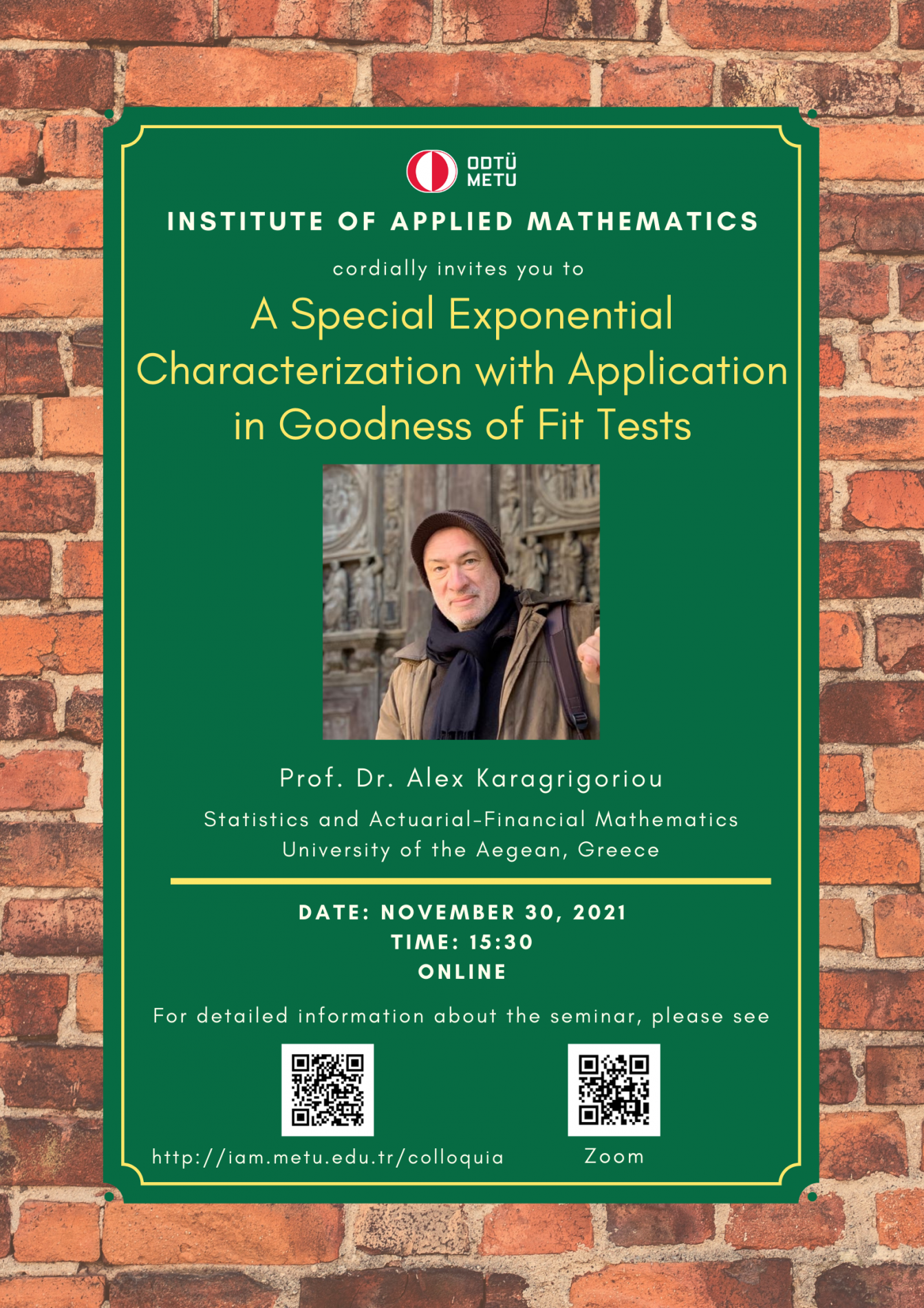 Affiliation: Statistics and Actuarial-Financial Mathematics University of the Aegean, Greece Speaker: Prof. Dr. Alex Karagrigoriou Invited by: Azize Hayfavi Date/Time: 30.11.2021 - 15.30 Abstract: This work is filling up the gap in the literature regarding the verification of the log-concavity property which is a widely studied topic due to the fact that it provides desirable estimating properties. At the same time, it is vital in reliability, engineering and stochastic modeling for distinguishing between an exponential, a light-tailed and a heavy tailed distribution. In this work we propose an exponentiality test of fit to be used for distinguishing between exponential and log-convex or long-concave distributions. The proposed test statistic is based on the conspiracy and catastrophe principles and establishes a characterization for the exponential distribution. The details of the formulation of the test are provided, an extended simulated study which shows the performance of the proposed test statistic is given, and some concluding remarks are stated. |