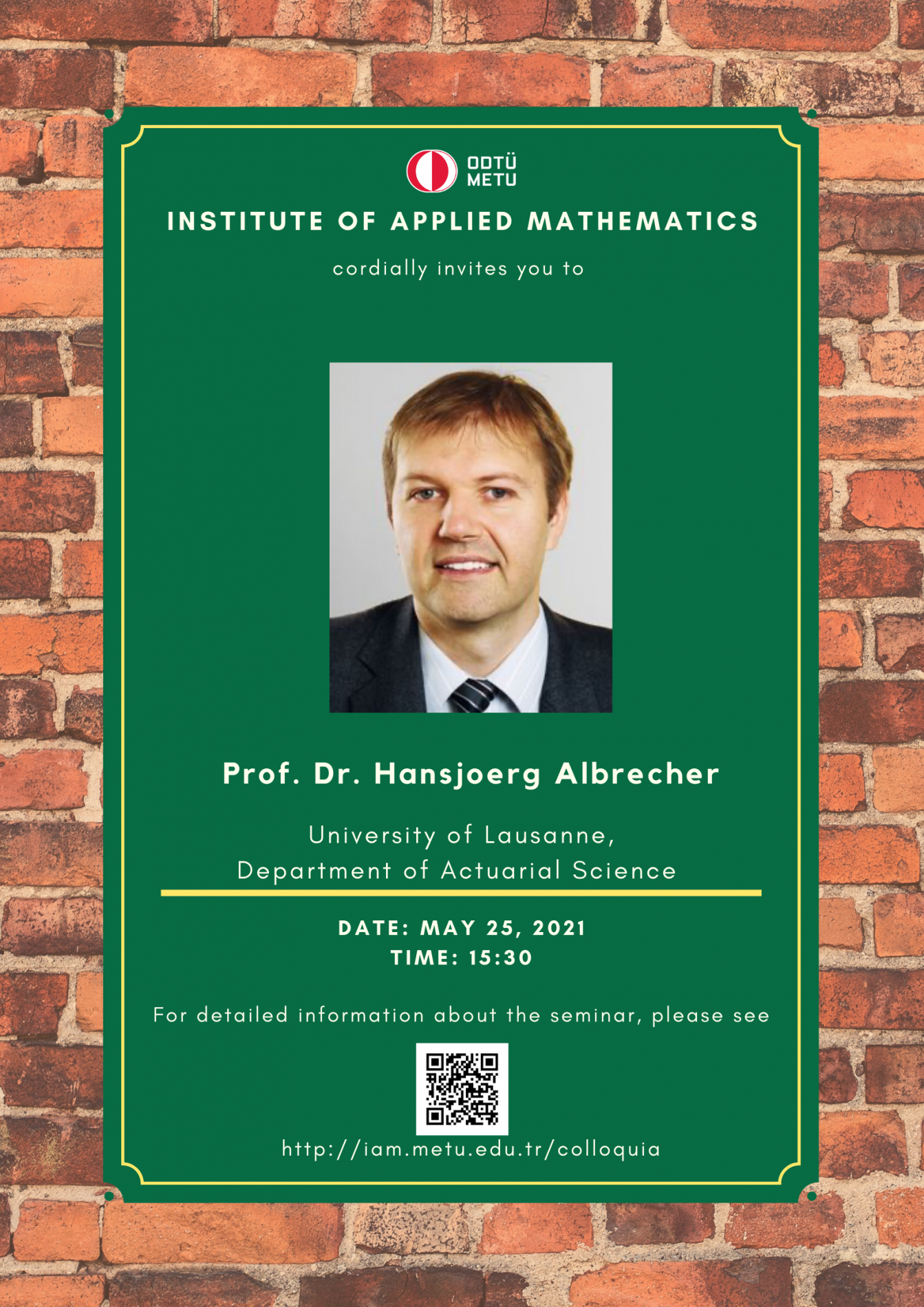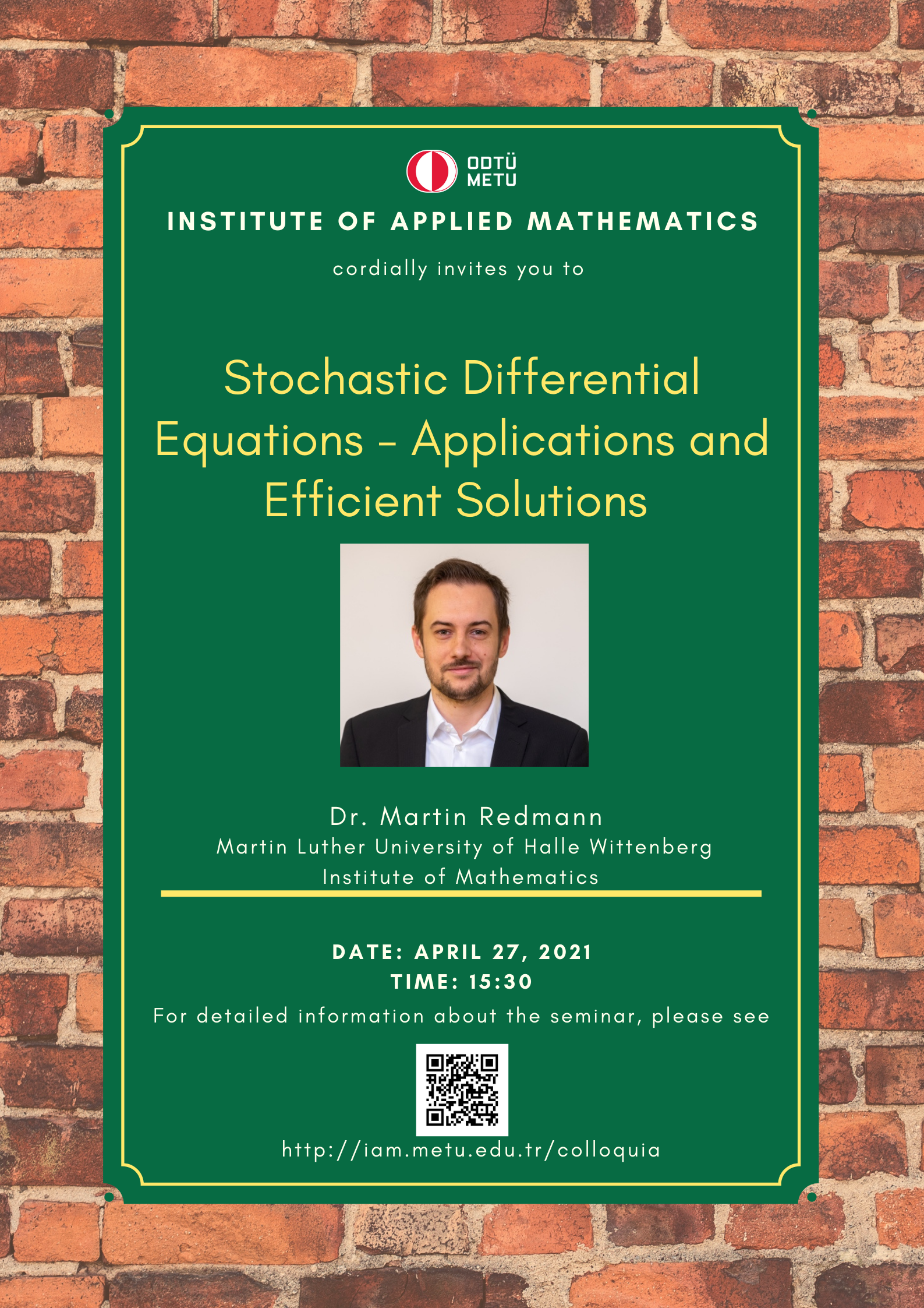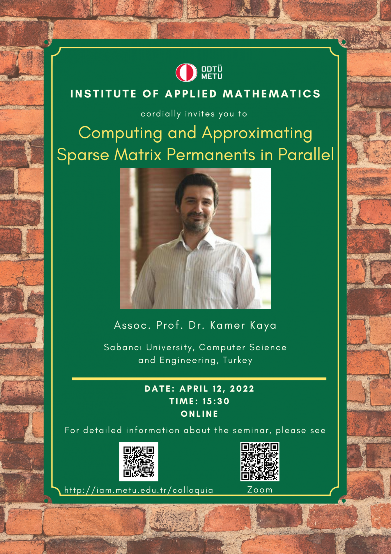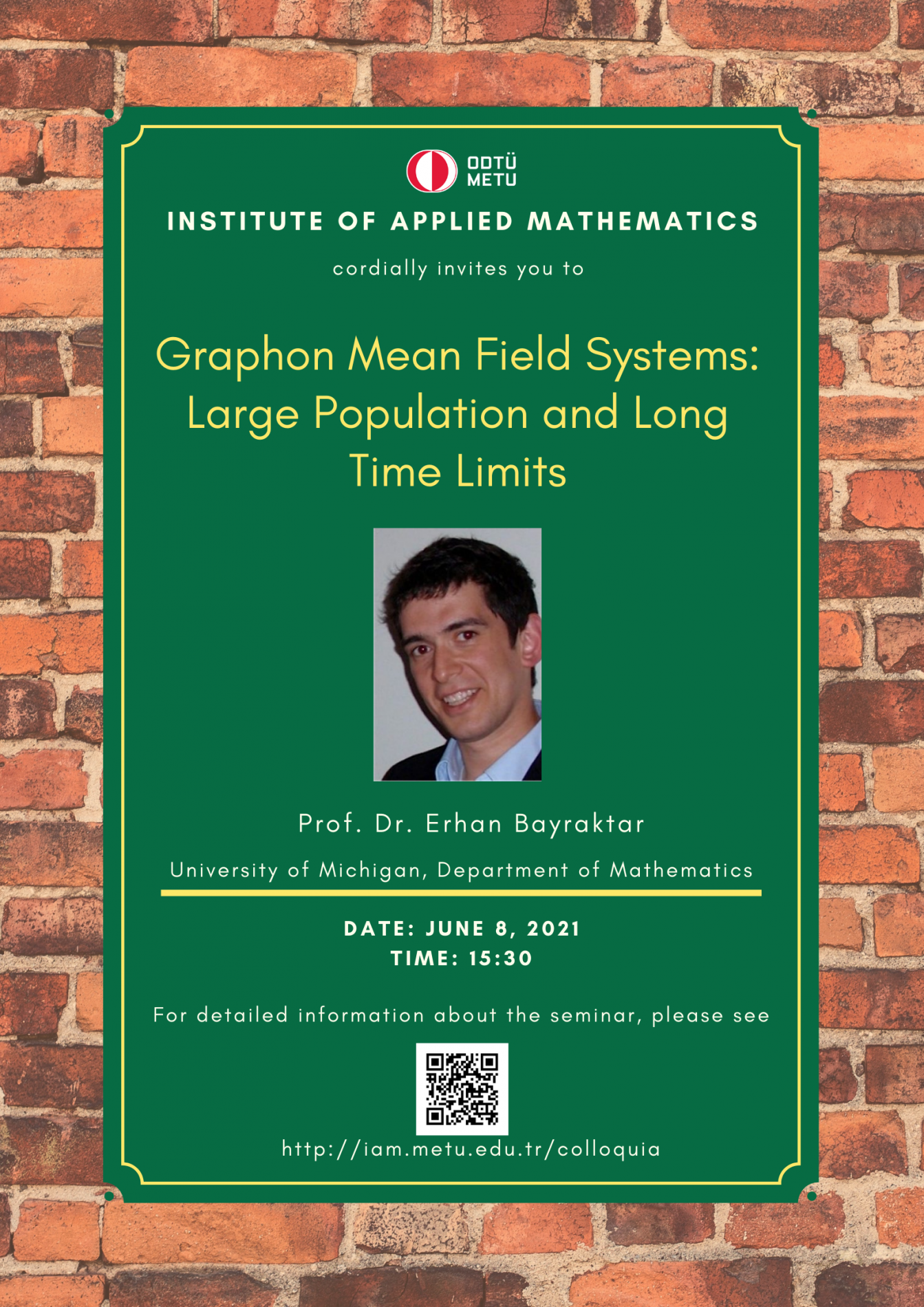 Institute of Applied Mathematics (IAM) is an interdisciplinary centre fostering various researches and teaching activities in mathematical sciences. In order to coordinate mathematics-based research as well as to undertake collaborative research with industry, IAM has established Colloquia (General Seminars), since its foundation in 2002, almost every Tuesdays in the afternoon. A colloquium at the institute usually lasts about 45 minutes.