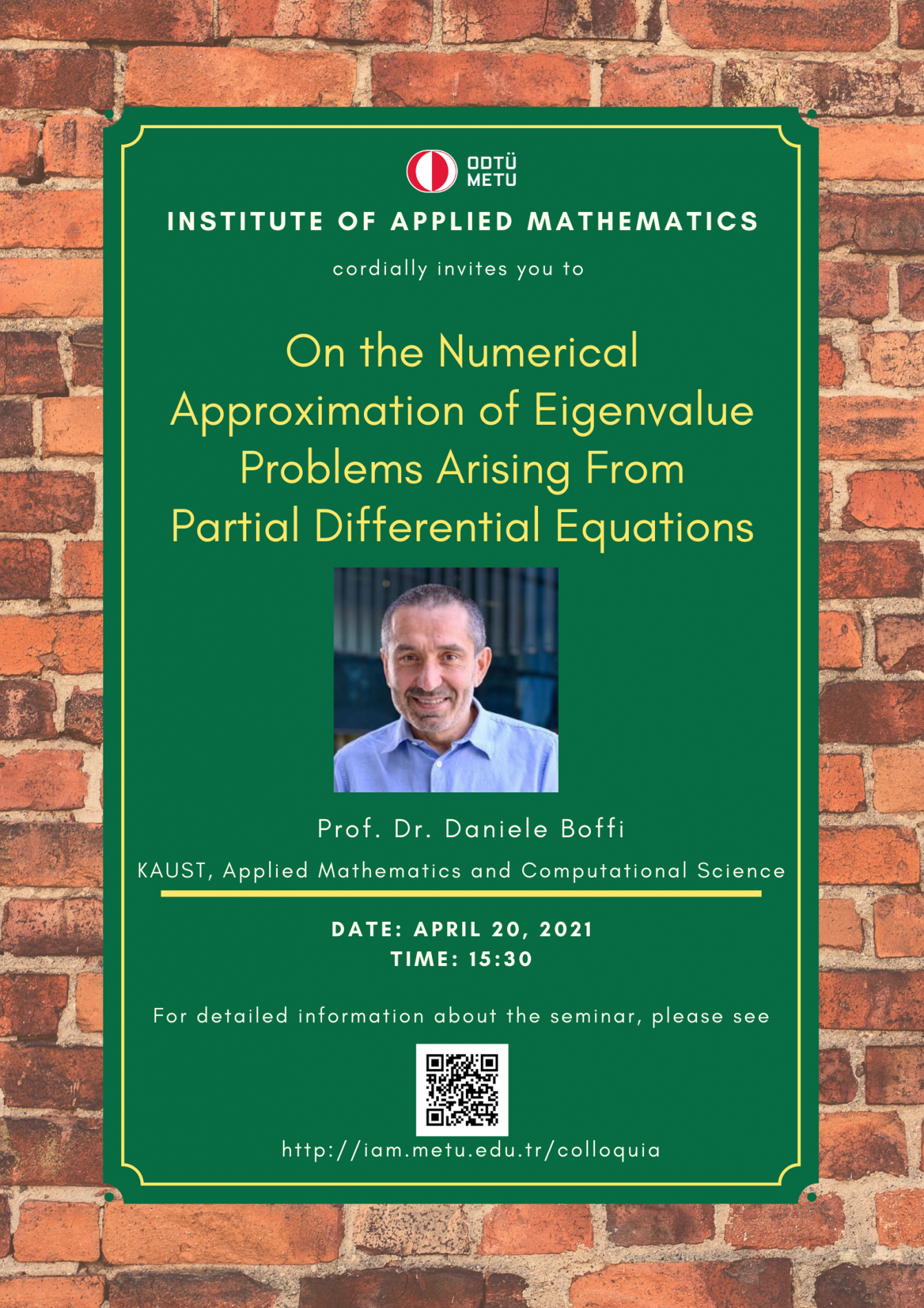 Speaker: Prof. Dr. Daniele Boffi, Applied Math, KAUST Invited by: Önder Türk Date/Time: 20.04.2021 - 15.30 Abstract: We discuss the finite element approximation of eigenvalue problems arising from elliptic partial differential equations. We present various examples of non-standard schemes, including mixed finite elements, approximation of operators related to the least-squares finite element method, parameter dependent formulations such as those produced by the virtual element method. Each example is studied theoretically; advantages and disadvantages of each approach are pointed out. |