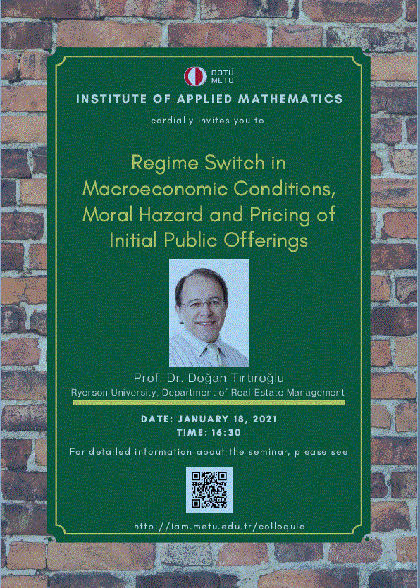 Affiliation: Ryerson University Speaker: Doğan Tırtıroğlu Invited by: A. Sevtap Kestel Date/Time: 18.01.2021 - 16.30 Abstract: We posit a new hypothesis on the pricing of IPOs and provide evidence on it from IPOs issued in Turkey between 1989 and September 2020. The hypothesis focuses on how a sudden and unexpected regime switch in macroeconomic conditions affects the pricing of IPOs. Remarkably and unexpectedly, high uncertainty "bleaches" even the well-established hot market effects on IPO initial-day returns. These are brand-new results in the literature and push macroeconomic uncertainty as a risk factor for IPOs to the forefront. Overall, Turkish issuers have left much less money on the table than others in the USA and elsewhere. This is another remarkable piece of finding and an addition to the rich list of puzzles of the IPO literature. |