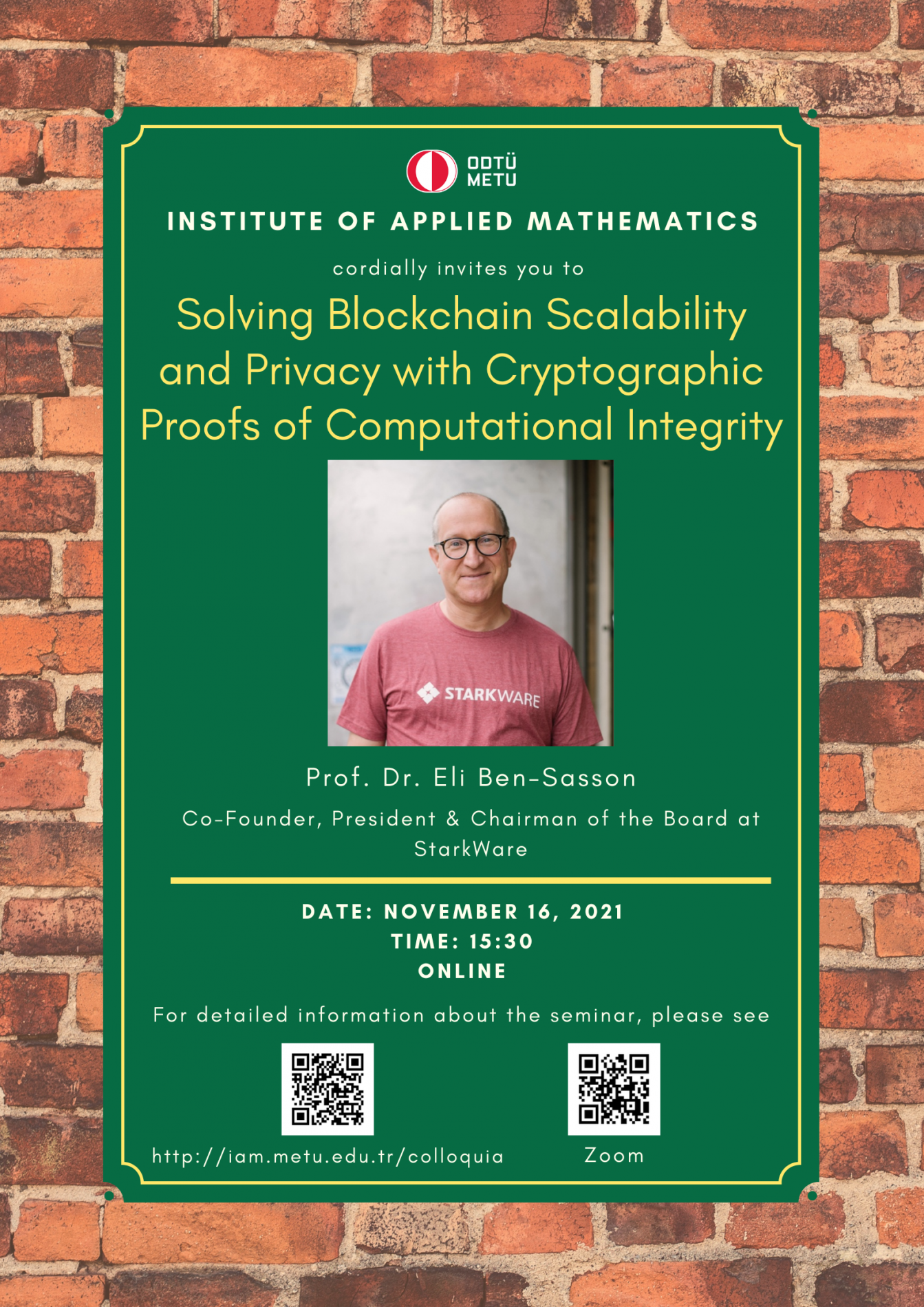 Speaker: Prof. Dr. Eli Ben-Sasson Invited by: Assist. Prof. Dr. Oğuz Yayla Date/Time: 16.11.2021 - 15.30 Abstract: Blockchains remove the need for trusted mediators (like banks), replacing them with trust based on Inclusive Accountability, which means that anyone with a laptop is invited to hold the blockchain accountable by inspecting all that transpires on it. However, If all may inspect the full blockchain, then privacy erodes. And if you insist on allowing anyone with a laptop to inspect all transactions, then the blockchains throughput must be capped. Is this inevitable? Cryptographic proofs, invented in the 1980's allow us to have our privacy+scalability cake and eat it too. ZK-STARKs are a culmination of three decades of academic research into cryptographic proofs, are best in class when it comes to scale and security, and are leading the pack in blockchain scalability. This talk will discuss the theory-to-product route taken by StarkWare, a company founded to implement ZK-STARK technology on blockchains, which is soon launching a layer-2 for Ethereum called StarkNet that makes cryptographic proofs accessible to all decentralized app developers. |