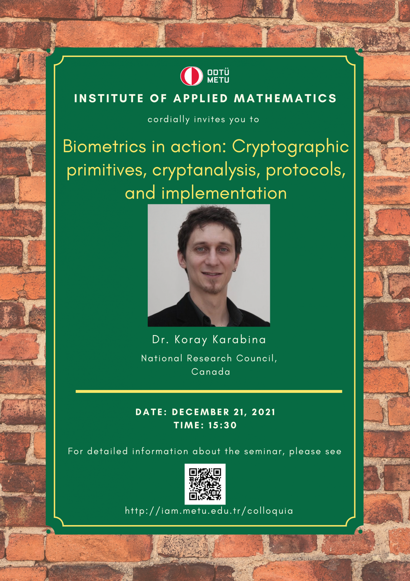 Affiliation: National Research Council, Canada Speaker: Dr. Koray Karabina Invited by: Murat Cenk Date/Time: 21.12.2021 - 15.30 Abstract: Password-based and single-factor authentication mechanisms have shown to be ineffective due to several convenience and security related challenges (e.g. generating and recalling strong passwords). Multi-factor authentication services try to remedy this situation by upgrading the static nature of passwords through the use of fresh and high-entropy tokens. Another limitation of authentication services is that they are designed to authenticate users only at the beginning of their session. Therefore, attackers who bypass the one-time initial authentication can have long-term unauthorized control of that session. Biometrics based continuous authentication protocols promise efficient, convenient, and secure alternatives to traditional authentication services. However, we face a number of challenges at different levels: how to design cryptographic primitives for biometrics?, how to design and implement continuous authentication protocols?, and how to justify the security of the system in the end? In this talk, I will discuss some of these challenges and present our recent protocol PACA: A Privacy aware continuous authentication protocol. |