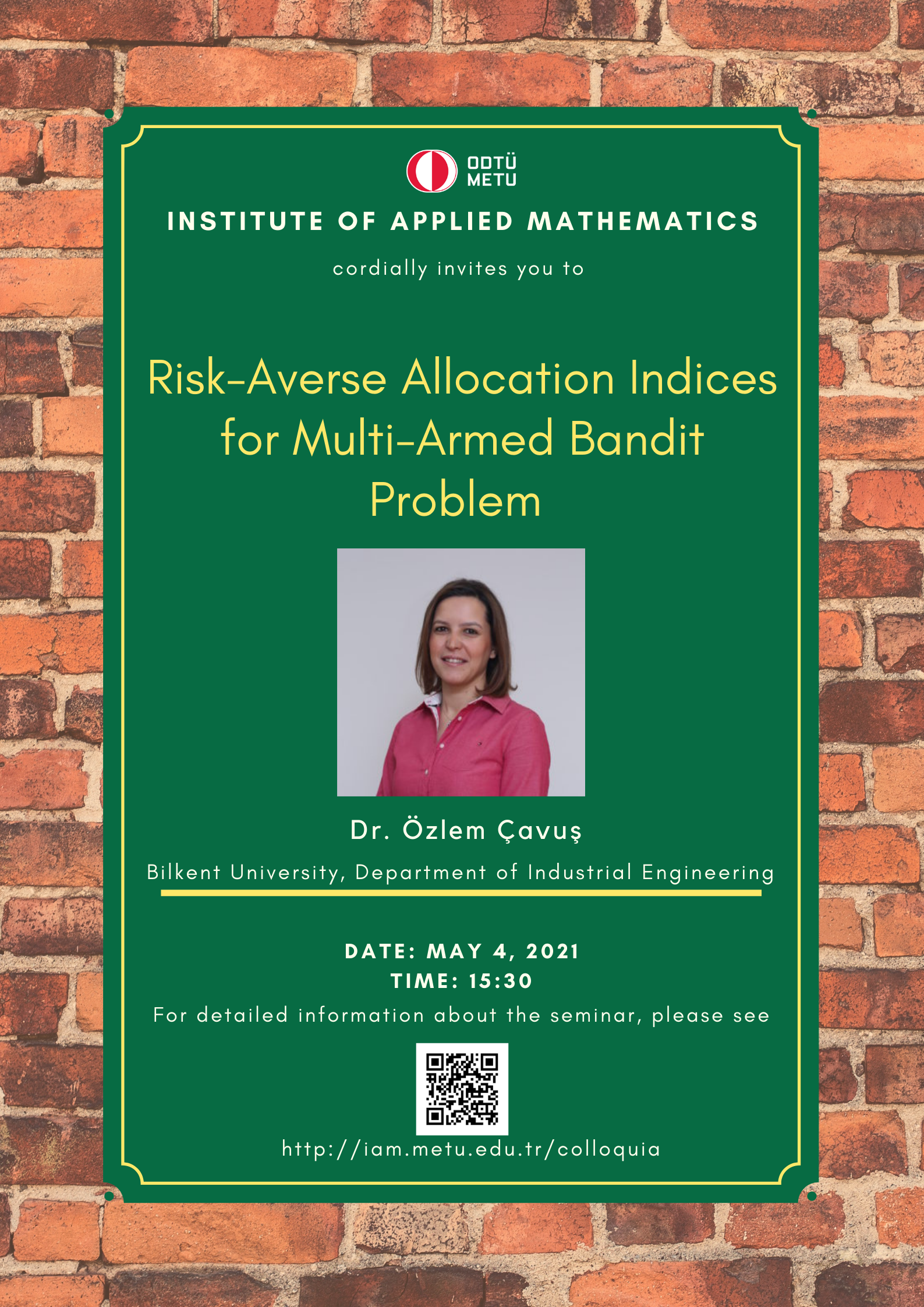 Affiliation: Bilkent University, Turkey Speaker: Assoc. Prof. Dr. Özlem Çavuş Invited by: Sevtap Kestel Date/Time: 04.05.2021 - 15.30 Abstract: In classical multi-armed bandit problem, the aim is to find a policy maximizing the expected total reward, implicitly assuming that the decision maker is risk-neutral. On the other hand, the decision makers are risk-averse in some real life applications. In this study, we design a new setting based on the concept of dynamic risk measures where the aim is to find a policy with the best risk-adjusted total discounted outcome. We provide a theoretical analysis of multi-armed bandit problem with respect to this novel setting, and propose a priority-index heuristic which gives risk-averse allocation indices having a structure similar to Gittins index. Although an optimal policy is shown not always to have index-based form, empirical results express the excellence of this heuristic and show that with risk-averse allocation indices we can achieve optimal or near-optimal interpretable policies. |