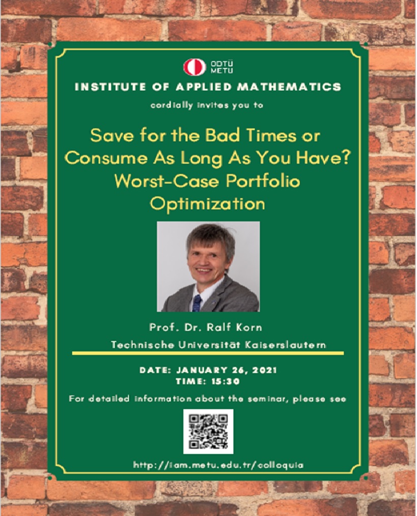 Affiliation: Technical University Kaiserslautern, Germany Speaker: Prof. Dr. Ralf Korn Invited by: A. Sevtap Kestel Date/Time: 26.01.2021 - 15.30 Abstract: We consider an investment and consumption problem in the face of a once-in-a-life-time event that causes the stock market to crash. However, there is no probabilistic information on the occurrence and the height of the crash. We are faced with Knightean uncertainty. Thus, traditional portfolio optimization approaches are not applicable. The talk contains an introduction into standard portfolio optimization methods and into the worst-case approach. A so-called life time consumption problem will be solved and leads to an explicit solution that depends on the character of the investor and that allows for economic interpretations. |