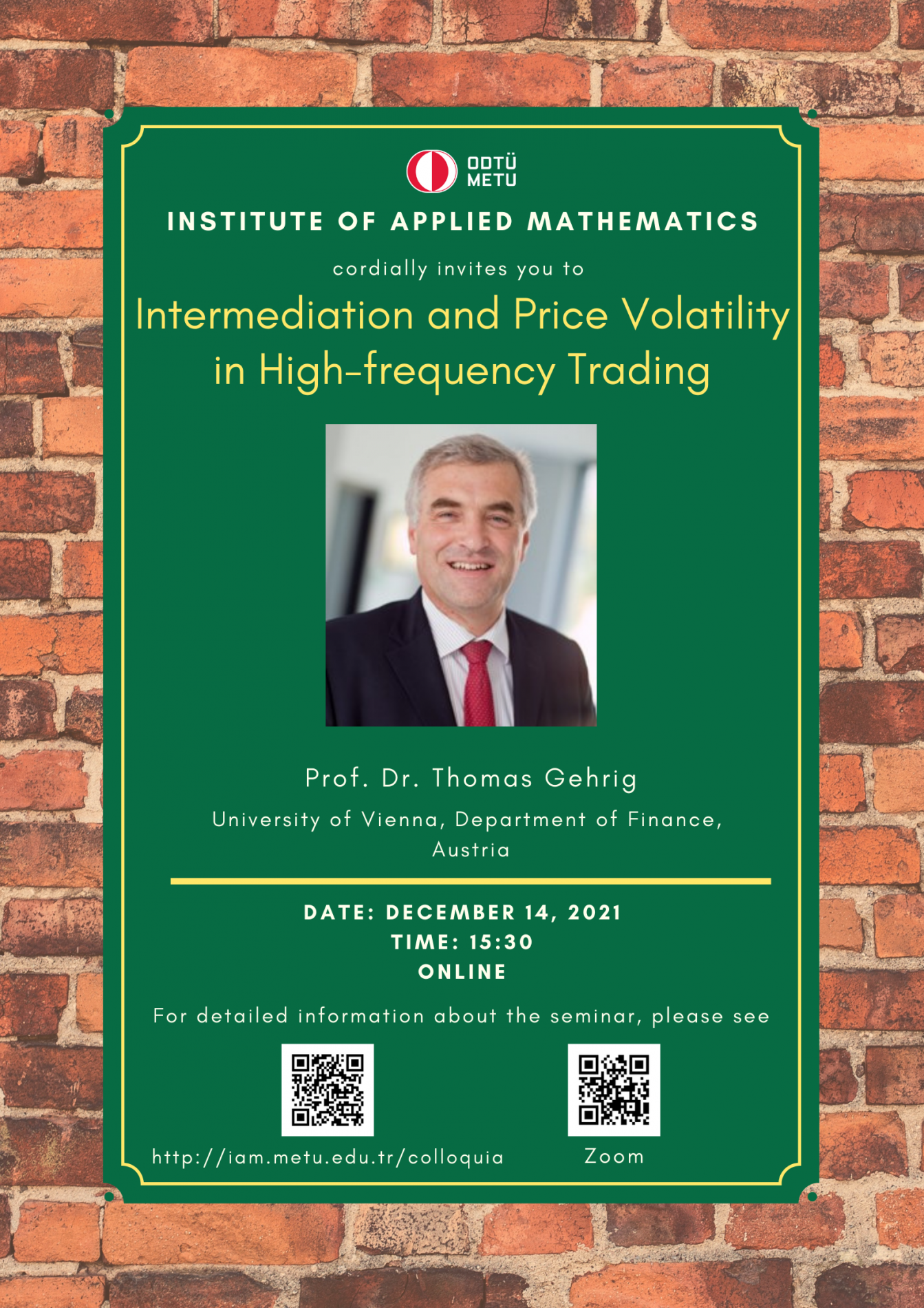 Affiliation: University of Vienna, Department of Finance Speaker: Prof. Dr. Thomas Gehrig Invited by: Prof. Dr. Sevtap Kestel Date/Time: 14.12.2021 - 15.30 Abstract: This study analyses the role of intermediaries in providing immediacy in fast markets. Fast markets are modelled as contests with the possibility of multiple winners where the probability of casting the best quote depends on prior technology investments. Depending on the market design, equilibrium pricing by intermediaries involves a trade-off, between monopolistic price distortion and excess volatility. Since equilibrium at the pricing stage generates an externality, investments into faster trading technologies are necessarily asymmetric in equilibrium, akin to markets with vertical product differentiation. Further, equilibrium is not necessarily effcient, since it is possible that a high-cost intermediary ends up investing excessively and thus trades more frequently than low-cost rivals. |