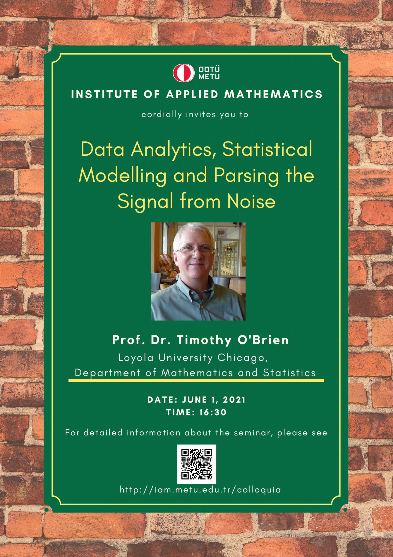 Affiliation: Loyola University Chicago, USA Speaker: Prof. Dr. Timothy O'Brien Invited by: Sevtap Kestel Date/Time: 01.06.2021 - 16.30 Abstract: Longitudinal data are ubiquitous in biomedical research, economics, environmental research, psychometrics as well as many other domains, and analysis of these data present unique and far-reaching challenges in applied statistical research. These data often also contain latent (hidden) cohorts/groups, which - with the aid of the EM algorithm and associated methods - can be discerned in order to help researchers in better understanding their data and underlying phenomena. Although the fields of Finite Mixture Models and Trajectory Analysis in the context of longitudinal data analysis is relatively new, controversy exists as to how best to discern these patterns and data. This talk focuses on the larger field of estimation and design of longitudinal data, with an eye to trajectory analysis and finite mixture models in modelling nonlinear phenomena. We make connections to the linear and generalized linear cases - as well as highlighting important differences and relevant software packages. We also weave in caveats related to over-fitting one's data. |
