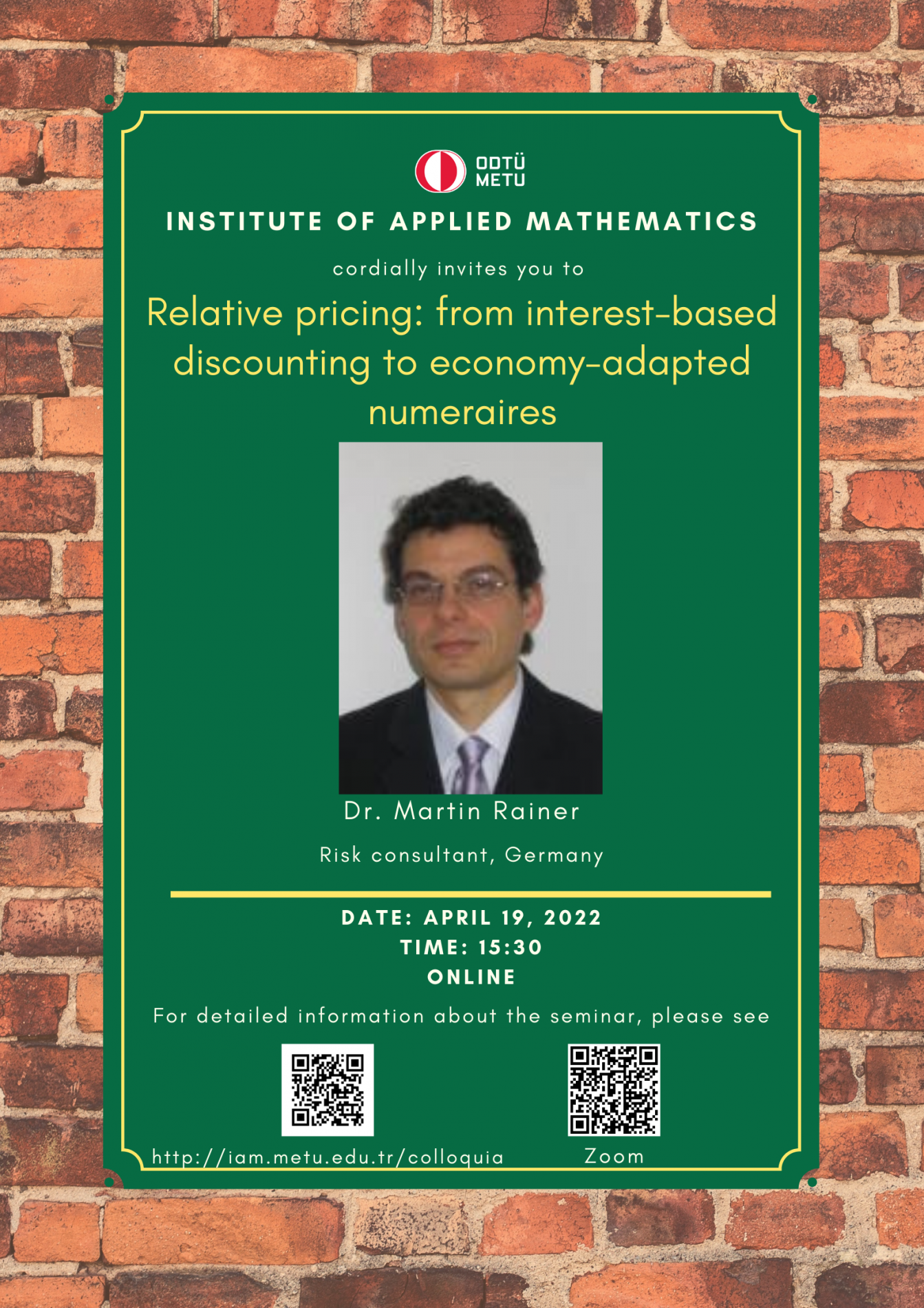 Affiliation: Risk consultant, Germany Speaker: Dr. Martin Rainer Invited by: A. Sevtap Kestel Date/Time: 19.04.2022 - 15.30 (Istanbul time) Abstract: The relative pricing method is reviewed under stochastic aspects. Traditional applications are e.g. forward rate simulations and FX quanto adjustments. After looking at some problems of the conventional numeraire, the concept of relative pricing w.r.t. economically key assets will be explained. Considerable advantages of this method over conventional pricing show up in contexts for increasing ecological sustainability e.g. by carbon pricing, or for economic stabilisation of critical resource prices such as agricultural commodities or energy. (Joint work with Dr. S. Aydın based on recent paper https://www.tandfonline.com/doi/full/10.1080/20430795.2020.1769983.) |