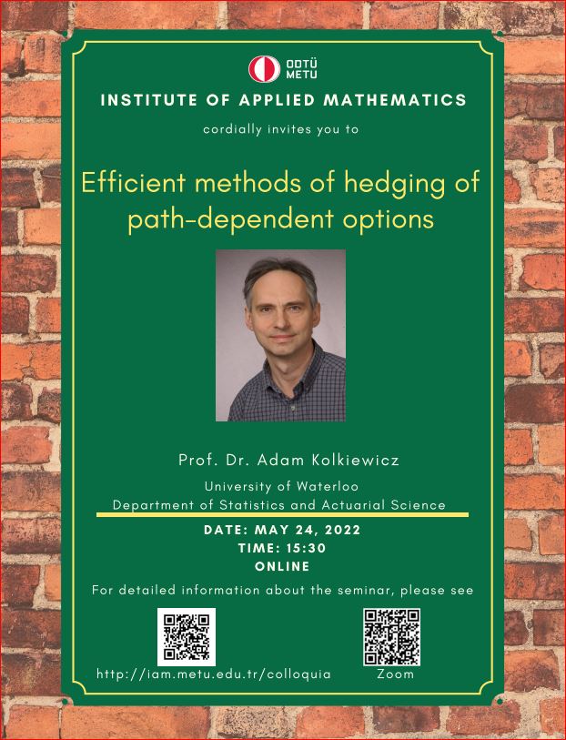 Affiliation: University of Waterloo, dept. of Statistics, Canada Speaker: Prof. Dr. Adam Kolkiewicz Invited by: A. Sevtap Kestel Date/Time: 24.05.2022 - 15.30 Abstract: It is well known that in a complete financial market, contingent claims can be hedged perfectly without any risk by using a continuously rebalanced hedging portfolio. The number of shares of the underlying risky asset in this portfolio, often referred to as delta or as a hedge ratio, can be obtained through the martingale representation theorem. Such hedging strategies work reasonably well also in practice, where trades occur in discrete times, if the rebalancing periods are not too long. In this talk we will use the Black–Scholes framework to demonstrate that discrete-time hedging of path-dependent options based on the standard delta is significantly less efficient than some of the optimal hedging strategies, regardless of the length of the hedging period. Using an Asian option as an example, we will provide an explanation of this phenomenon and will propose a correction of the standard delta that leads to an asymptotically efficient method. Time permitting, we will also discuss optimal in some sense static hedging methods for path-dependent options. |