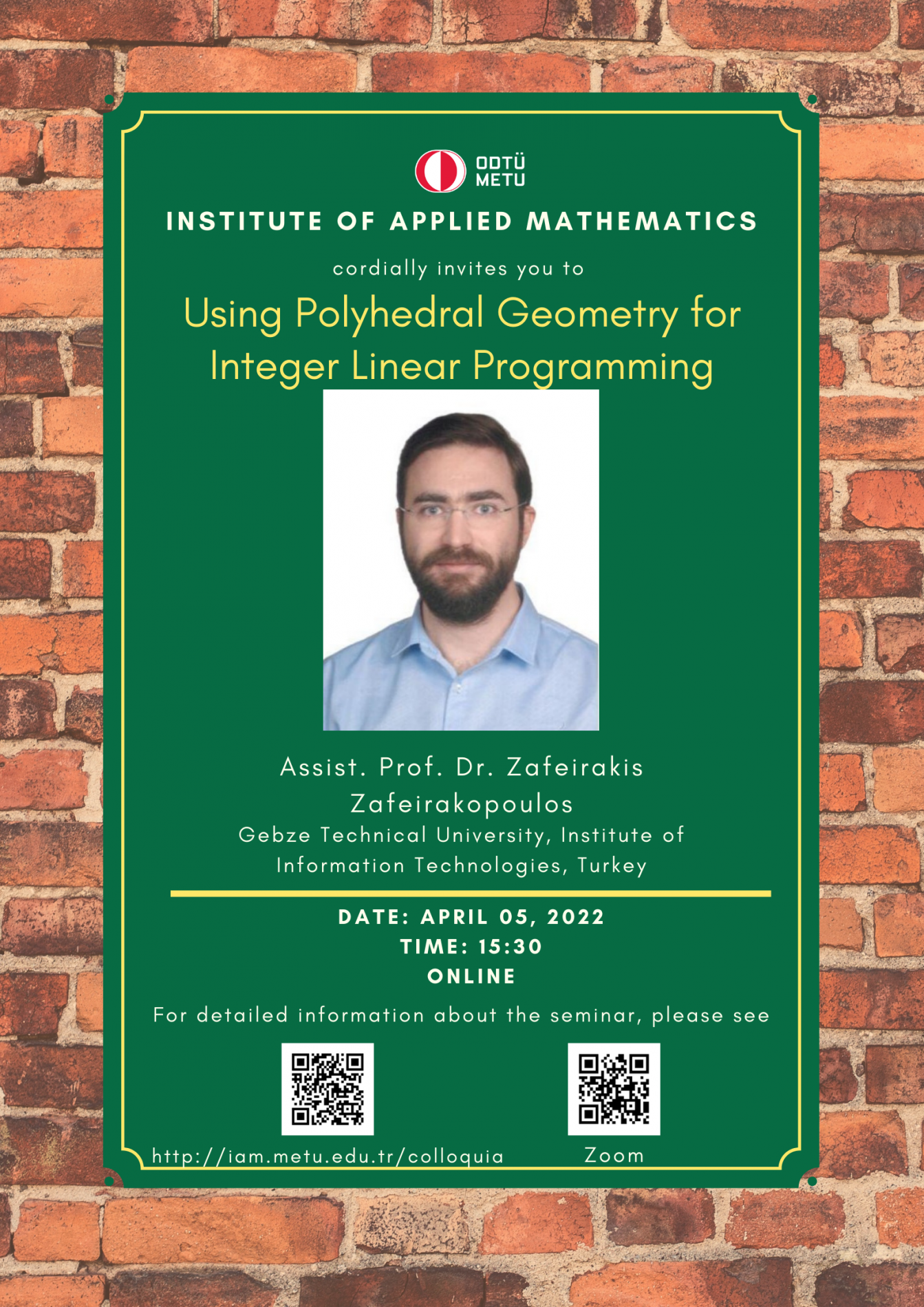 Affiliation: Gebze Technical University, Institute of Information Technologies, Turkey Speaker: Assist. Prof. Dr. Zafeirakis Zafeirakopoulos Invited by: Oğuz Yayla Date/Time: 05.04.2022 - 15.30 Abstract: Polyhedral Omega is an algorithm for solving linear Diophantine systems (LDS), i.e., for computing a multivariate rational function representation of the set of all non-negative integer solutions to a system of linear equations and inequalities. Polyhedral Omega combines methods from partition analysis with methods from polyhedral geometry. In particular, we combine MacMahon’s iterative approach based on the Omega operator and explicit formulas for its evaluation with geometric tools Bundled with Brion decomposition and Barvinok’s short rational function representations. This synthesis of ideas makes Polyhedral Omega by far the simplest algorithm for solving linear Diophantine systems available to date. After solving the feasibility problem of Integer Linear Programming (ILP), we will see how to use Polyhedral Omega for optimization. |