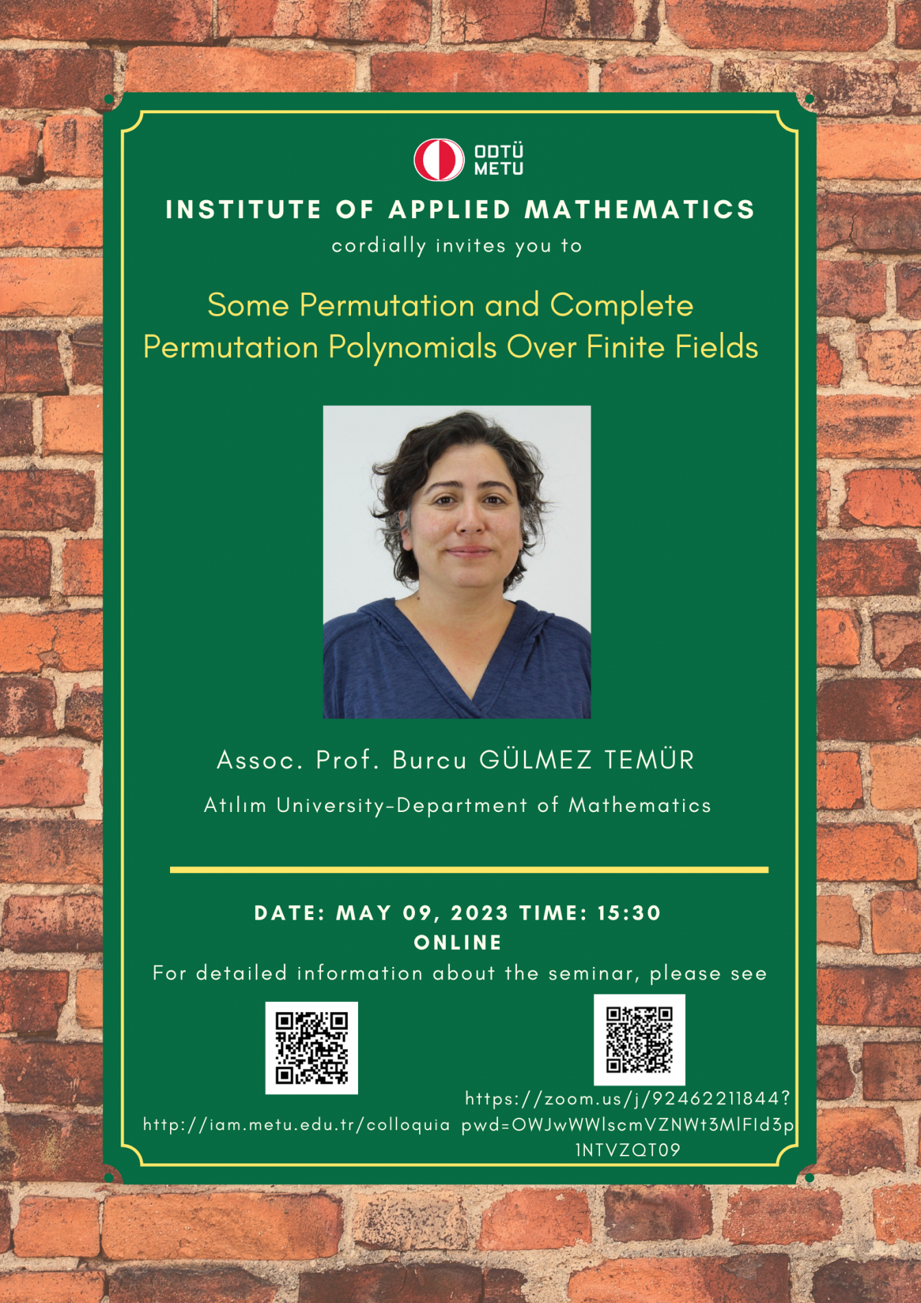 Affiliation: Atılım University Speaker: Burcu Gülmez Temür Invited by: Buket Özkaya Date/Time: 09.05.2023 - 15.30 Abstract: A polynomial g(x) is called a permutation polynomial (PP) whenever the associated function is a permutation. PPs are important in cryptography, coding theory and combinatorial designs. We present our recent results on PPs over finite fields. |
