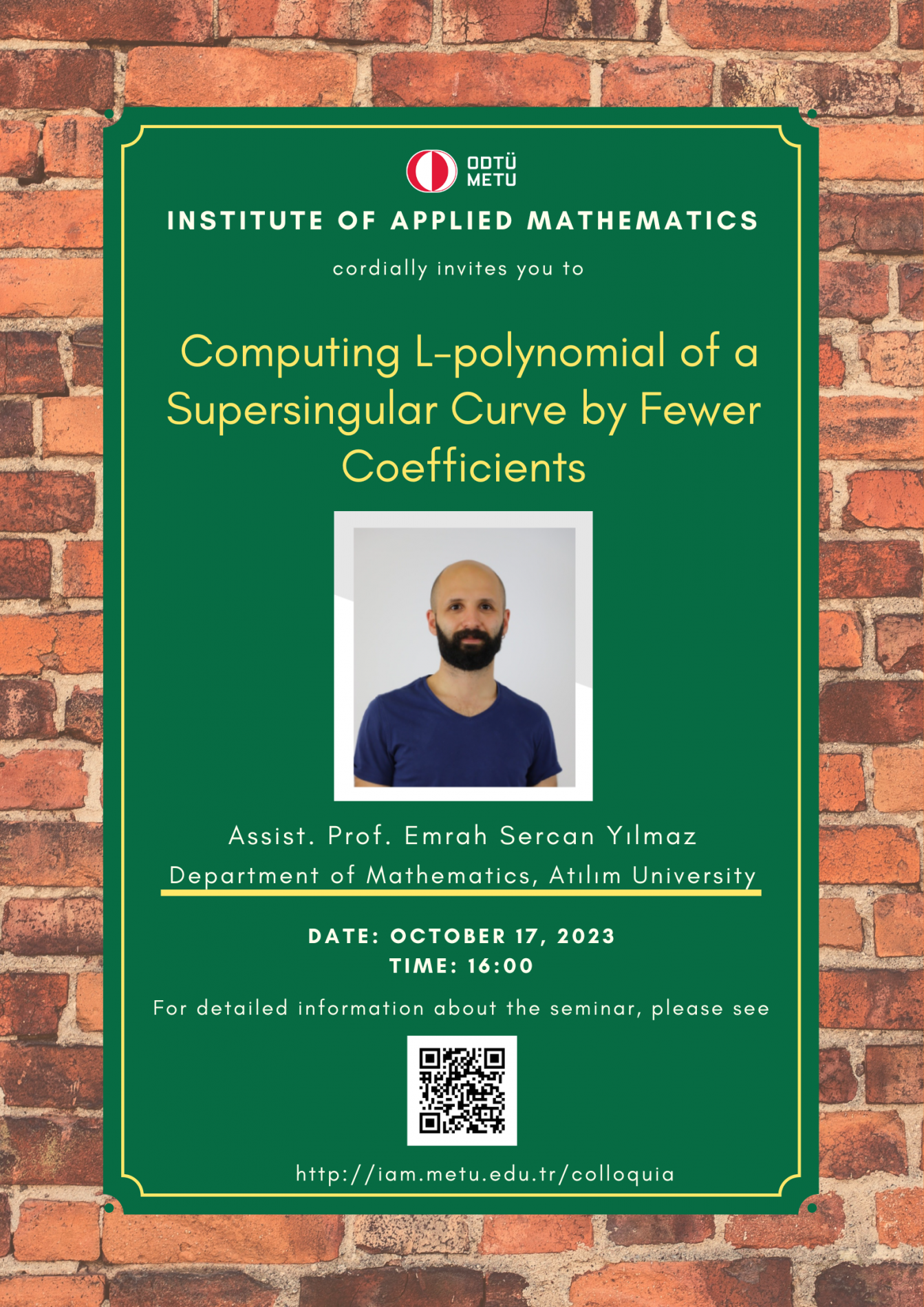 Affiliation: Atılım University Speaker: Emrah Sercan Yılmaz Date/Time: 17.10.2023 - 16.00 Abstract: The L-polynomial of a curve of genus g is determined by g coefficients. We show that the L-polynomial of a supersingular curve of genus g is determined by fewer than g coefficients. We characterize which coefficients are needed. |