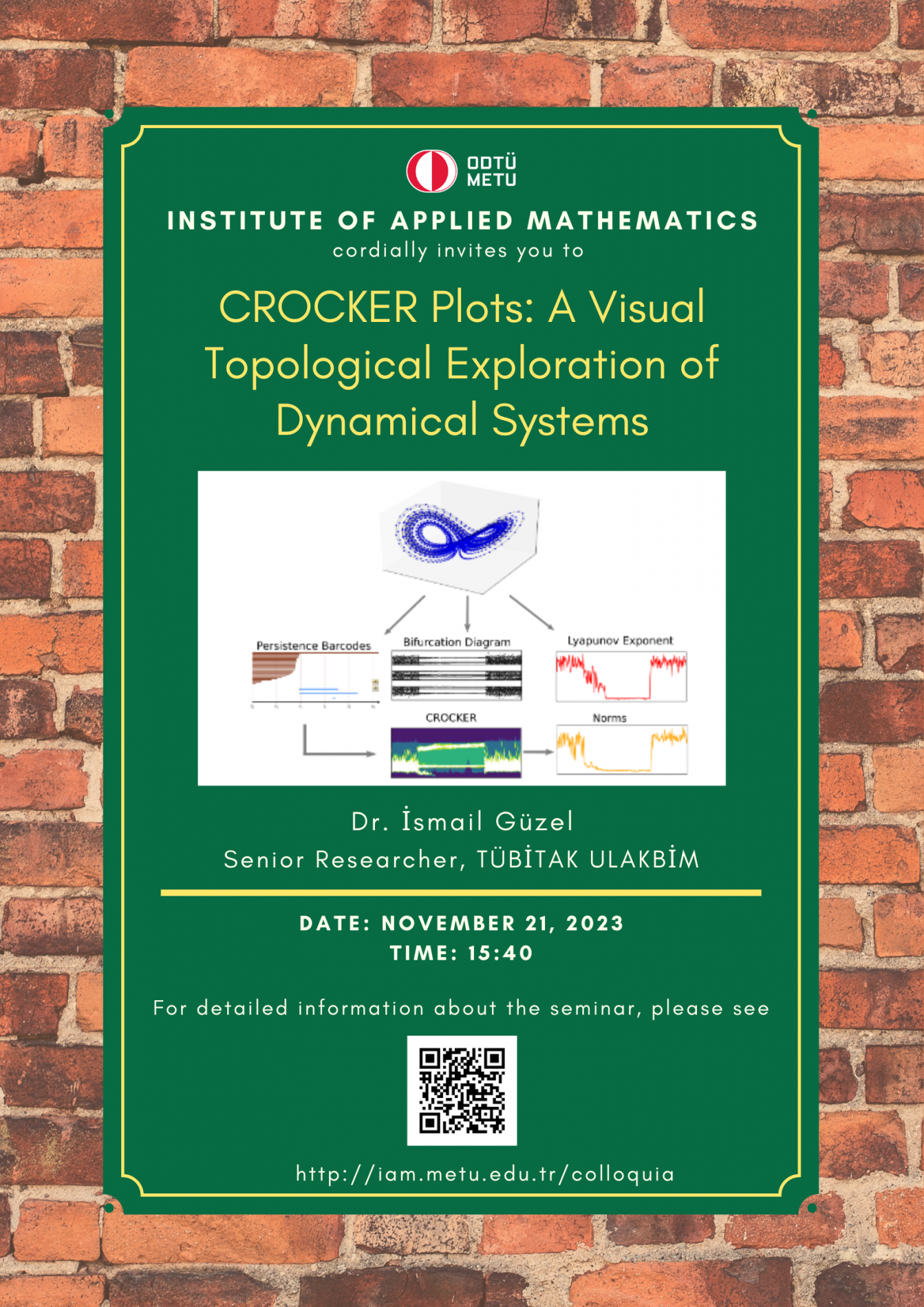 Affiliation: Senior Researcher, TÜBİTAK ULAKBİM Speaker: İsmail Güzel Date/Time: 21.11.2023 - 15.40 Abstract: CROCKER Plots: A Visual Topological Exploration of Dynamical systems. This seminar explores visual methods for topological data analysis. |