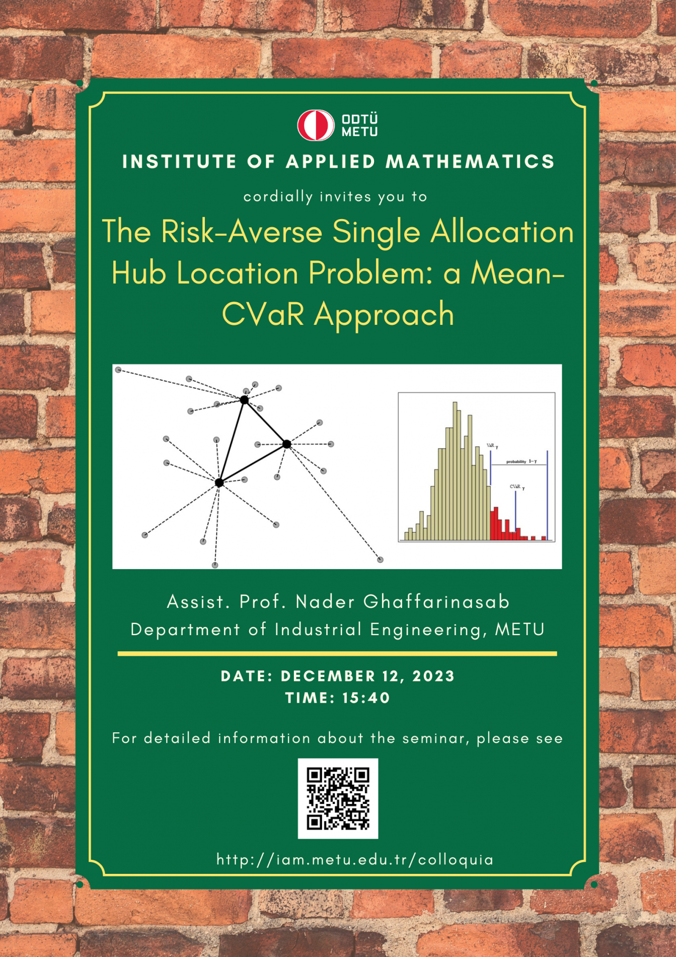 Affiliation: Middle East Technical University Speaker: Nader Ghaffarinasab Date/Time: 12.12.2023 - 15.40 Abstract: The hub location problem (HLP) is a fundamental facility planning problem. In this talk, a risk-averse single allocation HLP, where traffic volume is uncertain, is addressed. The problem is cast as a risk-averse two-stage stochastic problem using mean-CVaR, and a novel solution approach combining Benders decomposition is proposed. |