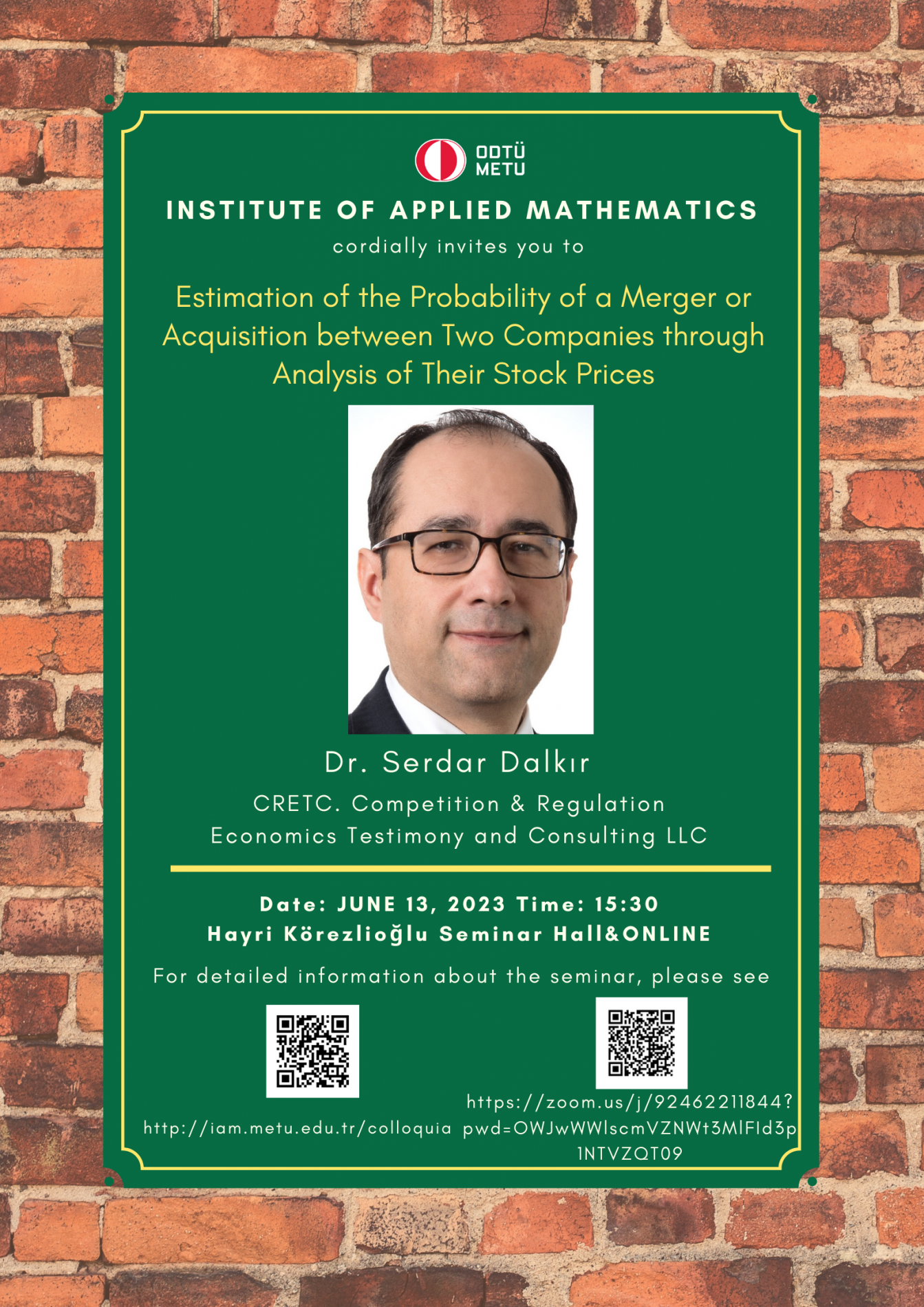 Affiliation: CRETC LLC Speaker: Dr. Serdar Dalkır Invited by: Prof. Dr. A. Sevtap Selçuk Kestel Date/Time: 13.06.2023 - 15.30 Abstract: Estimation of the Probability of a Merger or Acquisition between Two Companies through Analysis of Their Stock Prices. Customary event studies implicitly assume linear probability. We explore cases where true probability behaves differently. |
