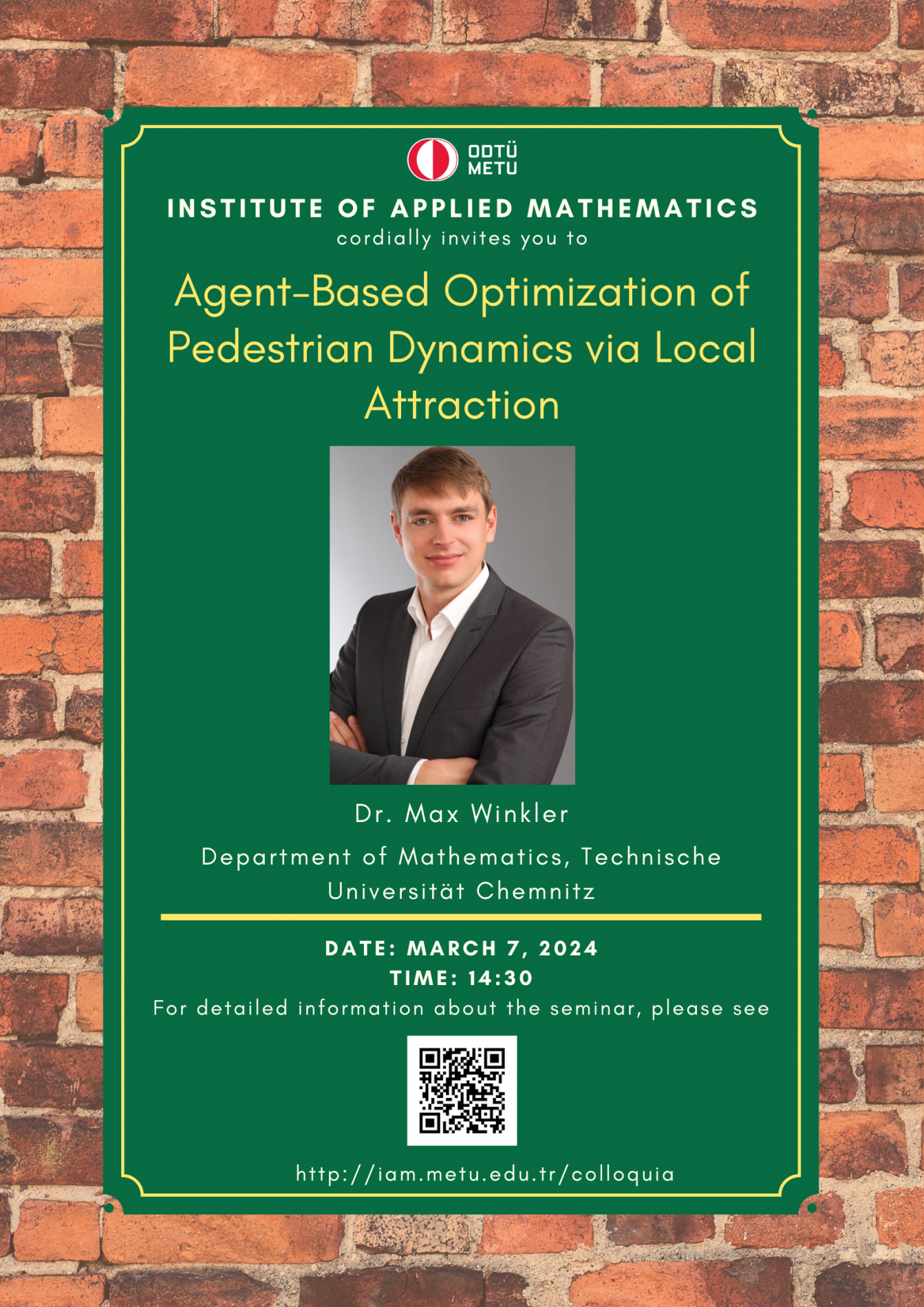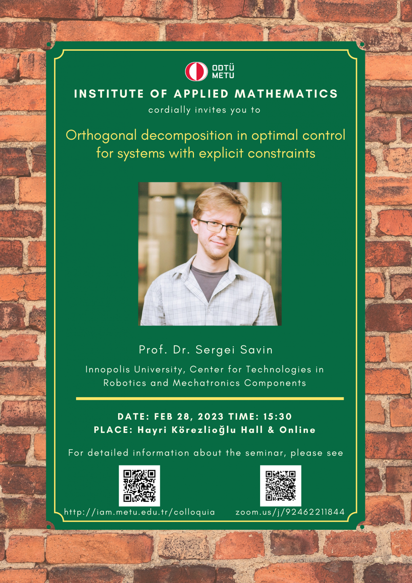Affiliation: Mathematics Group, METU NCC Speaker: Dr. Georgy Kitavtsev Date/Time: 26.03.2026 - 14.30 Place: Hayri Körezlioğlu Seminar Hall, IAM/METU Abstract: Information to be updated. |