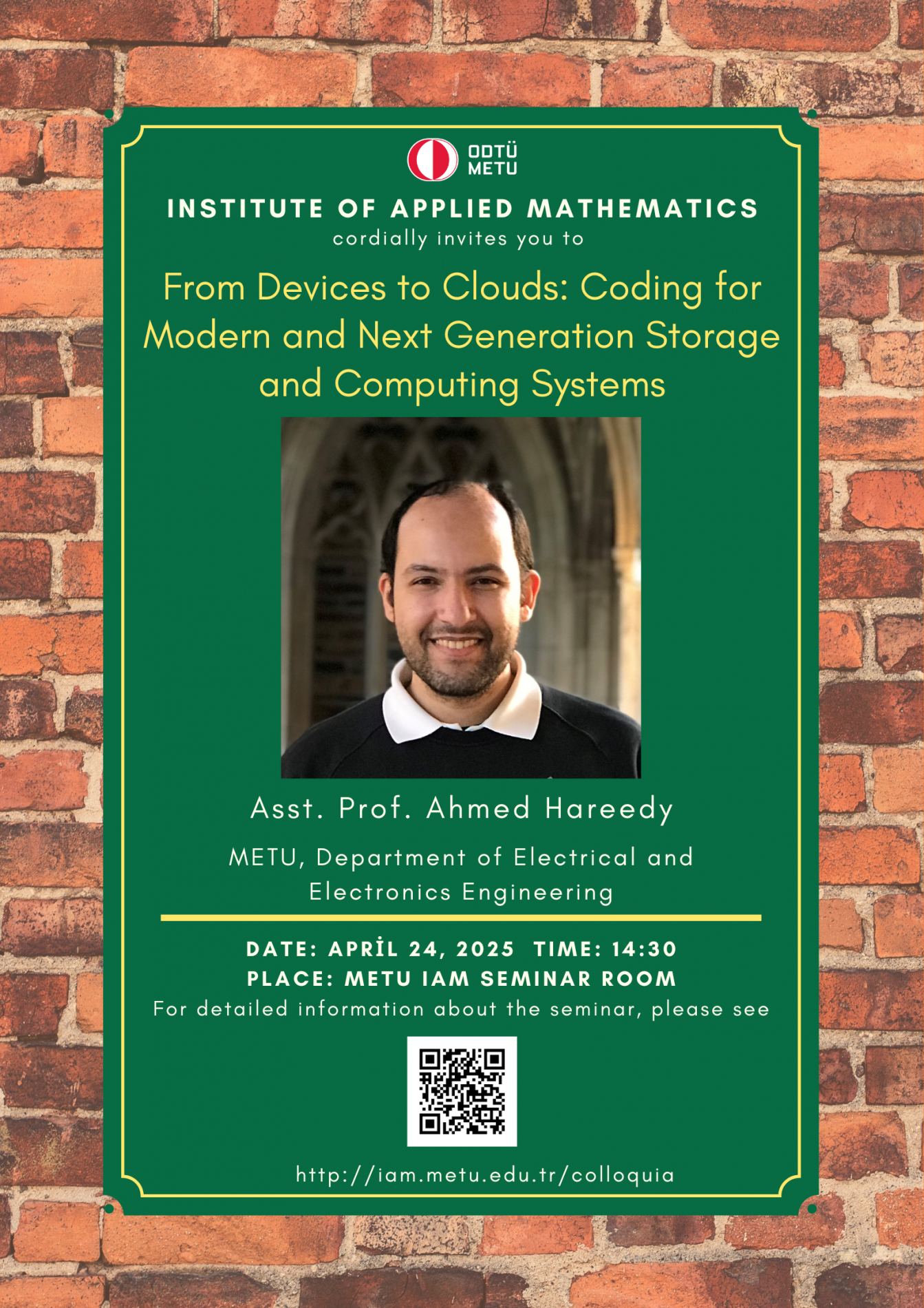 Affiliation: Department of Electrical and Electronics Engineering, METU Speaker: Assistant Professor Ahmed Hareedy Invited by: Assoc.Prof.Dr. Oguz Yayla Date/Time: 24.04.2025 - 14.30 Place: Hayri Körezlioğlu Seminar Hall, IAM/METU Abstract: The density of data storage devices has increased by a factor of 10,000 over the past 20 years. In this seminar, I will present effective coding techniques that take full advantage of new characteristics to increase the reliability of modern data storage and computing. I will introduce efficient reconfigurable constrained codes and high performance low-density parity-check (LDPC) codes. I will focus on modern Flash memory devices and discuss how machine learning and coding can help each other. |