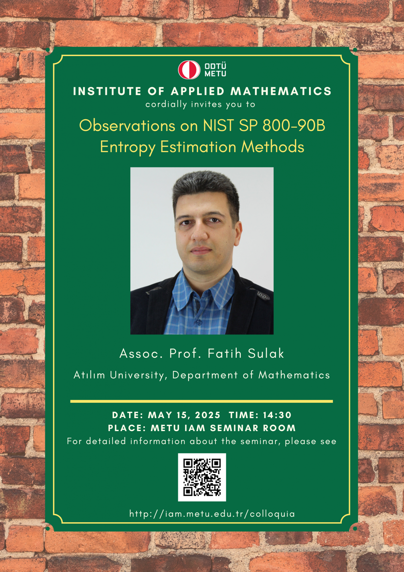 Affiliation: Atilim University, Department of Mathematics Speaker: Doç. Dr. Fatih Sulak Invited by: Assoc.Prof.Dr. Oguz Yayla Date/Time: 15.05.2025 - 14.30 Place: Hayri Körezlioğlu Seminar Hall, IAM/METU Abstract: In this talk, we evaluate the effectiveness and limitations of the SP 800-90 entropy estimation methods by exploring the accuracy of these estimators using simulated random numbers with known entropy, investigating the correlation between entropy estimates, and studying the impacts of deterministic transformations on the estimators. |